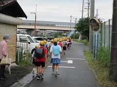 左右の間隔を広くして並びます。 片側通行で安全に下校します。