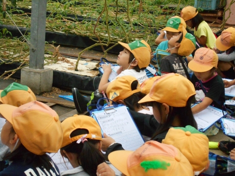 2年生が生活科の学習としてトマトハウスの見学へ行きました。たくさんのトマトを育てている様子を見学し、おいしいトマトを育てるための方法を教えてもらいました。話をしっかり聞き、メモをとりながら、一生懸命に勉強してきました。帰りにはトマトのお土産もいただきました。2年生は、トマトをはじめいろいろな野菜を学年園で栽培しています。そのために大切なことを学ぶことができました。
