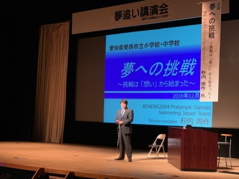 今日の午前中に、佐屋地区の小学6年生と中学1年生が、愛西市文化会館に集まり、夢追い講演会が行われました。講師を務めていただいたのは、愛知県出身で、アテネパラリンピック水泳競技の男子400m自由形リレー(視覚障害 49P)で銅メダルに輝いた杉内周作さんでした。
