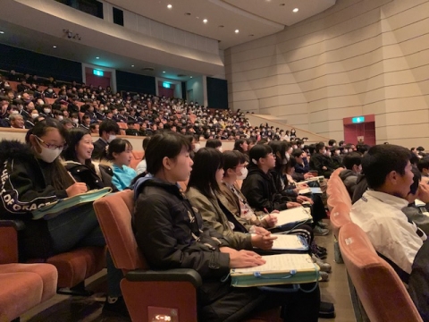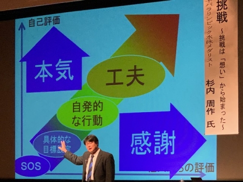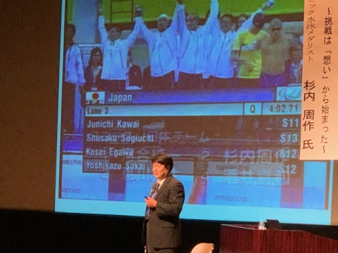 杉内さんは、会場にいるみんなへ、明るく元気に話しかけていただき、スタートから楽しい講演会になりました。視覚障害になったこと、その障害を乗り越えパラリンピック選手になったこと、そしてメダリストになったことなどご自身の体験から「夢をもつ大切さ」を熱弁していただきました。