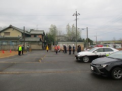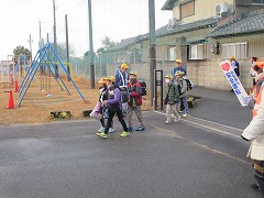 今日は、子どもたちの登校時に合わせて。津島警察や地域の見守り隊の皆さんが学校へ集まり、朝の見守り活動を行いました。