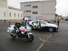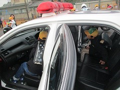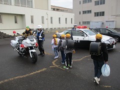 「おはようございます!」見守り隊の皆さんのあいさつを受けて校内に入ると、そこには白バイやパトカーが停まっています。「?」の表情を見せる子もいれば、満面の笑顔になる子もいました。去年と同じように、試乗体験もさせてもらいました。パトカーの試乗時に「ここで話すと、声も外へ出るよ。」とお巡りさん。試乗した子が試しにしゃべってみると、思ったよりも大きな声が車外に響き、登校してきた子たちも振り返っていました。大型の白バイに試乗させてもらい、笑顔になった子がたくさんいました♪ 皆さん、交通安全に気を付けて登下校してくださいね。