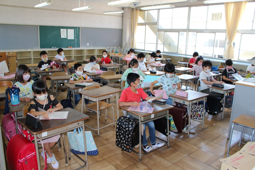3密を避けるために、学年を3等分に分けて少人数で授業をしたり、隣の子と間隔を開けて座ったりと、感染症予防対策を図りながらの学校再開となりました。