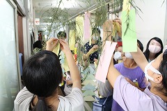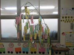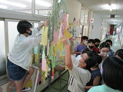 さて、翌朝です。登校した6年生の子が、「どうやって飾るんだ!?」と四苦八苦しながら短冊を笹にくくりつけていました。その後も、6年生が書いた短冊はどんどん増え、飾られた笹を見た他の学年の子も次々に飾り付けを増やしていきました。「(短冊をつるす)ひもがなくなりました!」「短冊がなくなりました!追加はありませんか?」子どもたちは、飾り付けが楽しくてしょうがないようです。すべての短冊を使い切って、お楽しみの時間は終了しました。昼休みには、見事な七夕飾りができあがりました♪ みなさんの願いが叶いますように・・・。