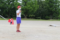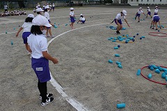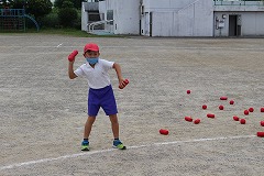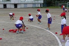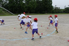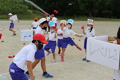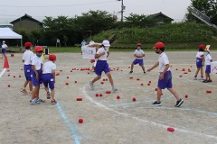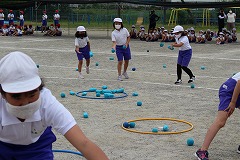 まずは低学年種目の『玉入れ』です。ねらいを定めて下からヒョイッ!!やさしくふんわり投げる子や、遠くのフラフープをめがけて力強く投げる子、玉を2~3個持って一度に投げる子、いろいろな方法で玉を投げていました。