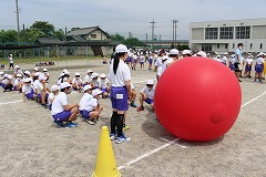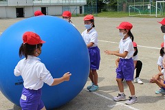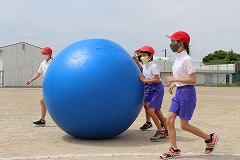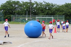 2時間目は中学年種目の『大玉転がし』です。自分の体よりも大きな大玉を、二人ペアになって力一杯転がしていきます。前が見えず、途中の障害物(マット)につまずいてしまう子もいましたが、友だちと協力して、楽しく転がすことができました。