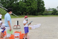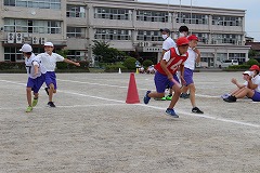 3時間目は高学年種目の『スウェーデンリレー』です。先に5年生が走り、その後6年生が走りました。バトンを上手につなぎ、抜きつ抜かれつ白熱したリレーが展開されました。声が出せない中、手拍子で応援をしました。みんな最後まで力一杯走りきりました。