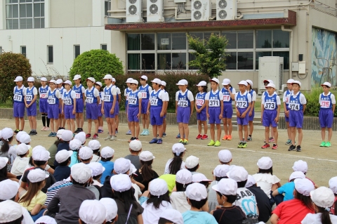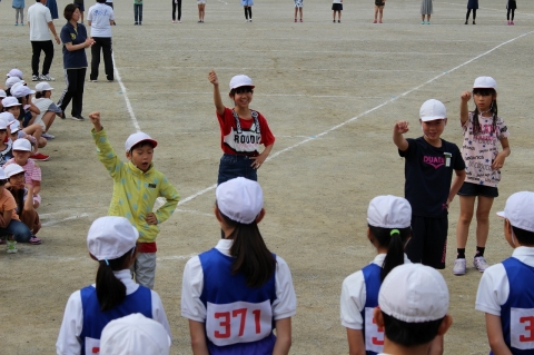 運動場に全校児童が集まり、選手となったメンバーが入場し、選手紹介が行われました。選手のみんなは堂々とした態度で自分の名前とともに出場種目を伝えていました。選手紹介が終わると、児童会代表の激励のあいさつと高学年を中心とした応援団からのエールが選手に送られました。たくさんの応援団からのエールに選手のみんなは力をもらったことでしょう。その後、リレーメンバーによるリレーのデモンストレーションが行われました。リレーメンバーの速い走りを見て、応援とともに驚きの声もあがっていました。