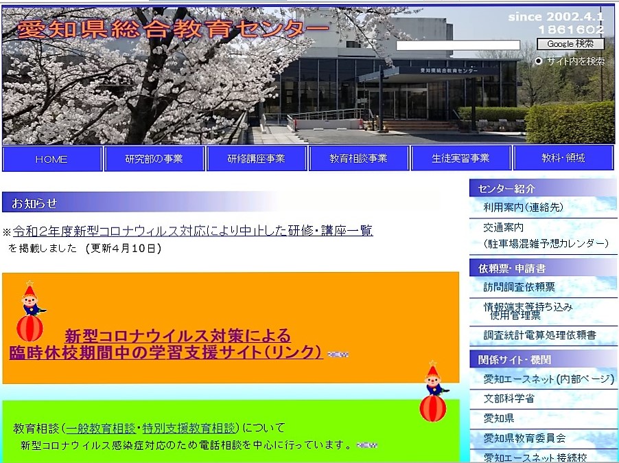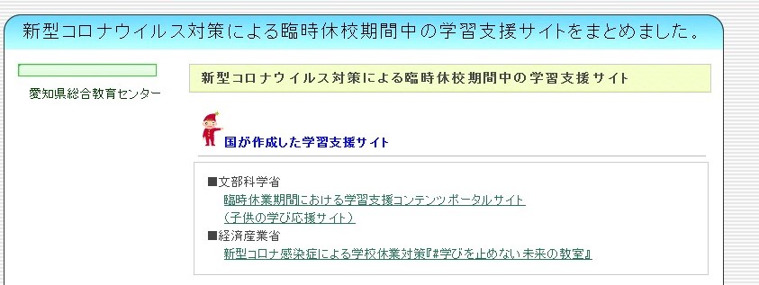 新型コロナウイルス対策による臨時休校期間中の学習支援サイトが、愛知県総合教育センターホームページに開設されました。