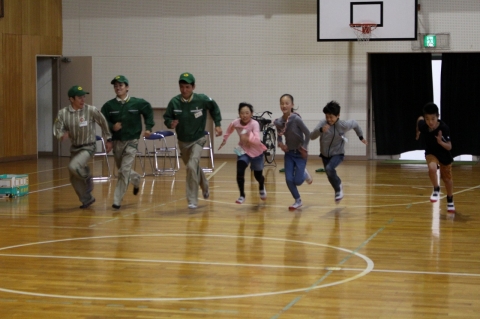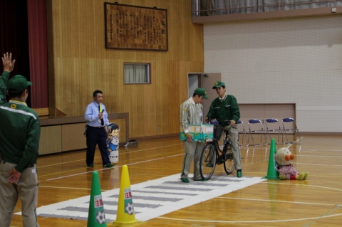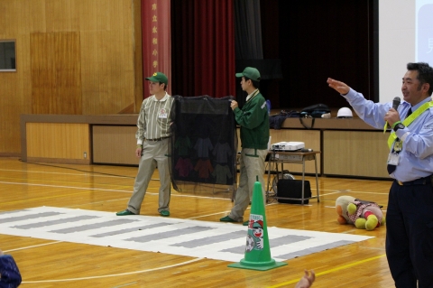 体育館に横断歩道を用意し、段ボールの自動車や人形、自転車を使って、直感的にわかるように説明してもらいました。
