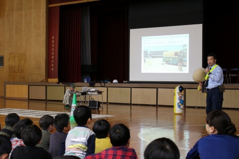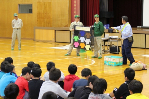 今年の交通安全教室は、「クロネコヤマトの宅急便」で有名なヤマト運輸の社会貢献課のみなさんを講師にお招きし、開催しました。2時間目には1~3年生の児童を、3時間目には4~6年生の児童を対象に次のような内容で行いました。