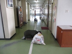 来賓玄関前の廊下では、ごみを捨てに来た6年生が周りを見ながら安全な場所を探し、その場でしゃがみ一次避難の体勢を取りました。静まり返る校舎内。訓練でも、次の指示が聞けるように静かにできているようです。