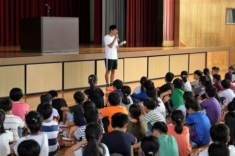 最初に校長先生から夏休みを振り返り、9月からも笑顔で元気に頑張ろうというお話をしていただき、みんないい姿勢で、静かに聞いていました。また、体育主任の細田先生から小中合同運動会についてお話がありました。小中合同運動会のチームは以下のようになります。