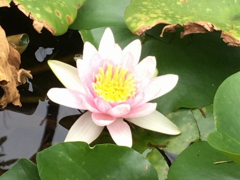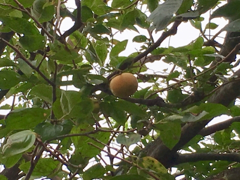 校庭の柿の木に、たくさんの実がつきはじめました。その近くにある観察池の蓮が、この時期になぜかきれいな花を咲かせています。
