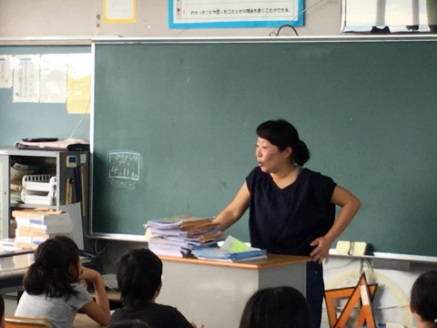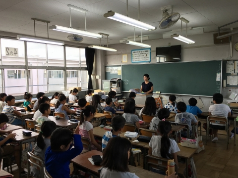 夏休みが終わり、みんなが元気に登校し、9月がスタートしました。体育館などの工事は、9月も引き続き行われているため、9月最初の朝礼も校内放送で行われました。校長先生のお話に続き、9月から4年2組の担任になる河野裕加里先生のあいさつがありました。その後、河野先生は4年2組のみんなと教室で出会い、新たなクラスのスタートを切りました。