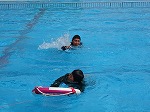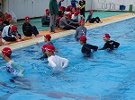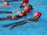 服を着たまま歩いたり泳いだりして、服が重いことや泳ぎにくいこと、体力を使うことを体験しました。実際におぼれている人を見たら、水に入って助けようとすると、引っ張られたり抱きつかれたりして自分もおぼれてしまいます。それで、助けるときは、浮き輪やペットボトルを投げて生き残れるようにしてあげるのがいいということを体験しました。