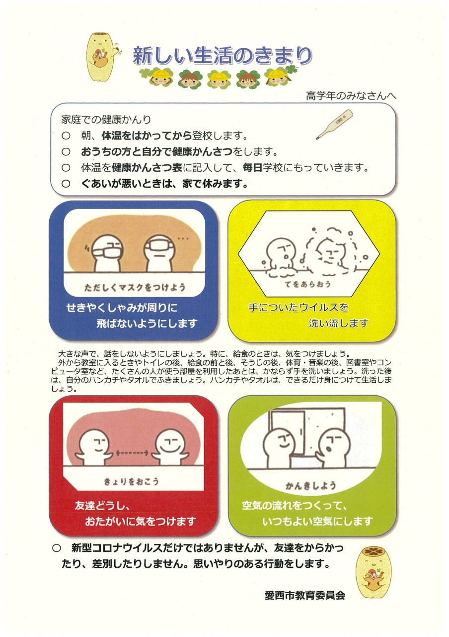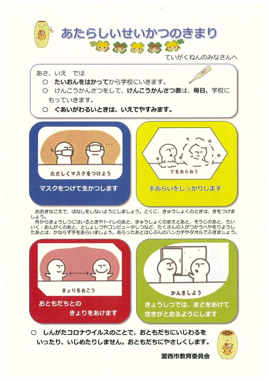本日、学校生活を送るうえでのきまりが書かれたプリントを配付しました。ご家庭でもお子様と一緒に読んでいただき、声がけをしていただければと思います。