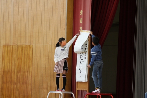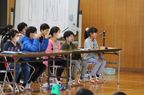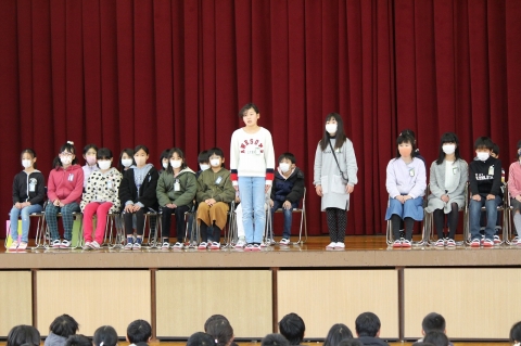 そして、児童会役員選挙の本番を迎えました。立候補者のみなさんと推薦責任者のみなさんは、舞台の上で少し緊張した面持でした。しかし、自分の番がきて、演説をし始めると、堂々とした姿で、自分の思いや公約を話していました。聞いている人たちもしっかり立候補者たちを見て、真剣に聞いていました。