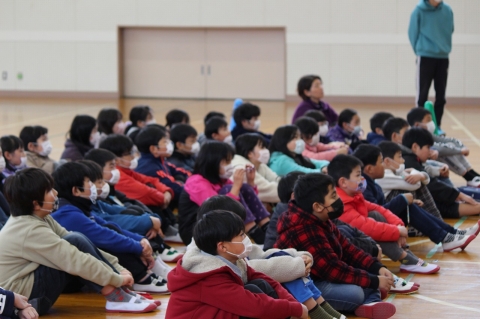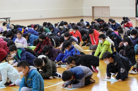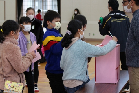 立会演説会が終わると、体育館のフロアで投票用紙に記入し、投票しました。来年度の新4年生となる3年生も今回初めて児童会役員選挙に参加しましたが、よい態度で臨み、自分で決めた候補者の名前を書き、しっかり投票していました。