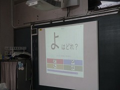 ひらがなの一部を拡大した4つの部分図の中から、お題のひらがなの拡大図を正しく見つけだす問題です。そのひらがなに特徴的な部分を探し出して答えを選びます。「赤だと思う人?」というように先生に聞かれ、子どもたちは挙手で答えていきました。「ゲームみたい」とある子が言いました。そうです、学んだことをクイズ形式で復習するアプリです。またできるといいですね。