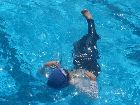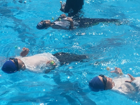 そして、本日は二宮先生が6年生へ着衣泳の授業を行ってくれました。二宮先生は、最初に「今日は命を守る授業です」という言葉からスタートしました。そして、服を着たまま水の中を歩く体験や泳ぐ体験を通して、水を含んだ衣服が体にまとわりついて、動きにくいことを6年生のみんなへ体感させてくれました。その後、川や海でおぼれた時、助けてもらえるまで浮いていることの大切さを教えていただき、ペットボトルを利用して浮き続ける練習をしました。最後に二宮先生の体験談を交え、自分の命を守るために大切なことを教えていただきました。