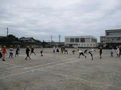 合同運動会が4日になりました。本番までにはまだ時間があるので、練習にゆとりをもって取り組んでいます。今日は、高学年のダンス練習がお休みで、5-1は6時間目に夏休み前に行う予定だったレクを行いました。レクが実現していないことを子どもたちはしっかり覚えていて、2か月越しに実現したというわけです。 行ったのは王様ドッジの変形版で、子どもたちがルールを改良して行いました。当たると負けの王様以外にも『騎士』などの役割があり、たとえば『魔術師』は、ボールに当たっても外野に行くことがありません。ですので、敵の前に立ちふさがり、ボールに自ら当たりに行くというプレーも見られました。運動会の練習が続く中、少し心が安まる時間となりました。