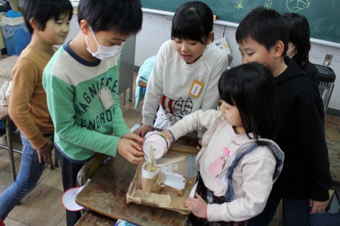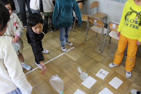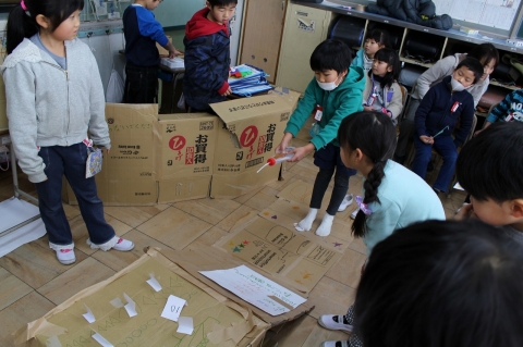 今日の3・4時間目に、2年生が1年生を招待し、南館2階で『わくわくフェスタ』が開催されました。2年生の児童たちは、授業参観で保護者の方をお客さんにリハーサルしたかいがあり、準備から運営までスムーズに行っていました。的当てやくじ引きなどの楽しい遊びができるブースがあり、どのブースも2年生の児童たちがアイディアを出し合い、工夫して作った遊び道具がならんでいました。そのブースで1年生の児童が楽しく遊べるように2年生のみんなが説明したり、サポートしたりと一生懸命に働いていました。いろいろなブースで遊んだ1年生も大満足で、2年生のお兄さん・お姉さんに感謝の気持ちでいっぱいでした。1・2年生のみんなの楽しそうな声が響き渡ったすてきな3・4時間目でした。