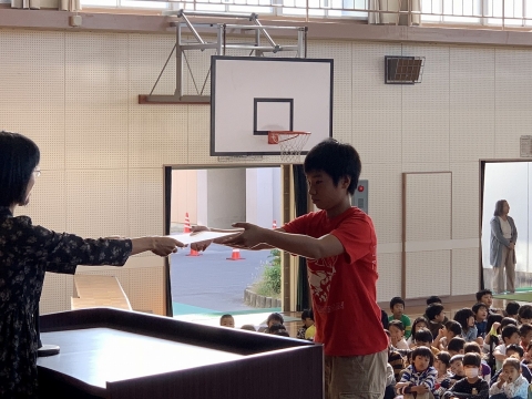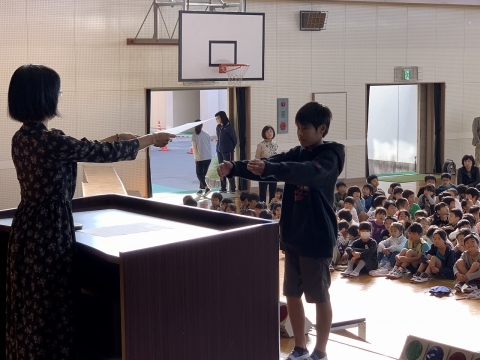 サッカー、バスケットボール男子は、見事に優勝しました。今日の朝礼で、全校児童の前で表彰されました。そして、サッカー部、バスケットボール部に参加したすべての児童に頑張りをたたえる拍手が贈られました。