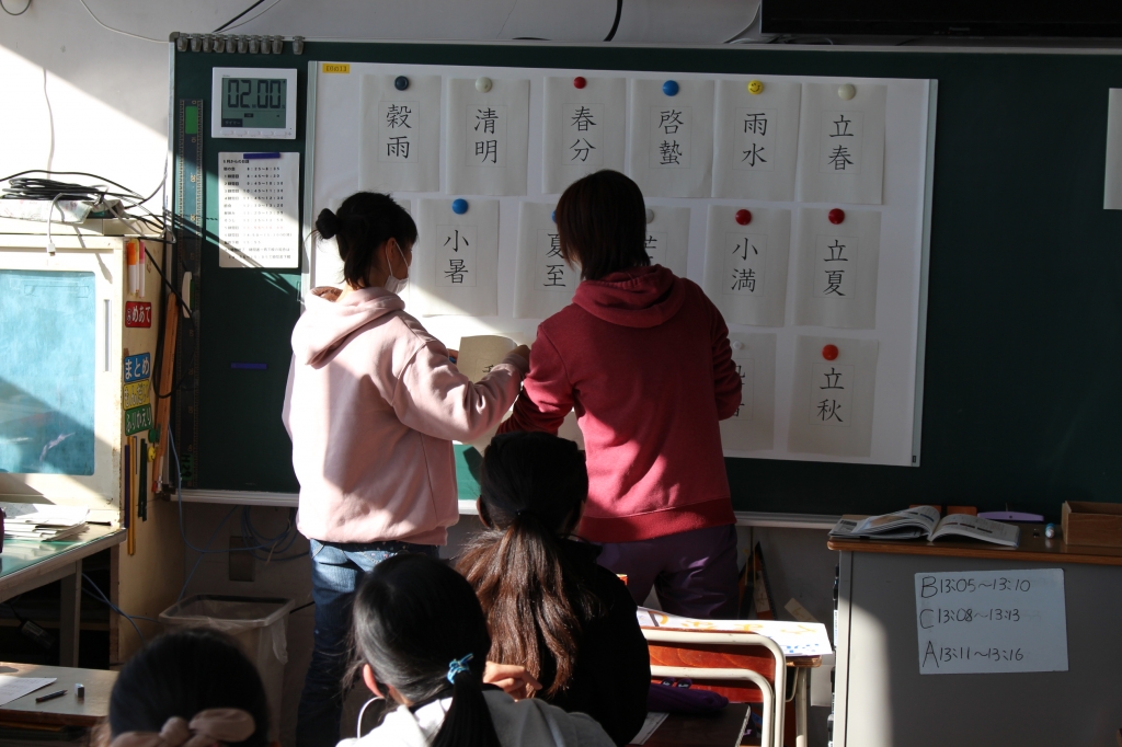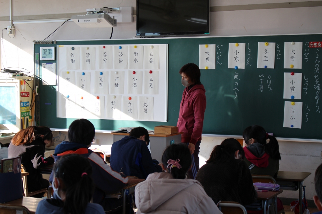 6年生は、『冬のおとずれ』の学習で二十四節気についての学習をしました。黒板に掲示された二十四節気の漢字を見て、二十四節気の並び替えをしました。どの子も漢字の意味を考え、いつ頃の時季なのか予測し、楽しみながら並び替えていました。