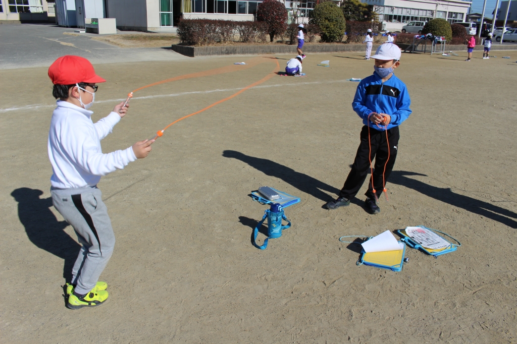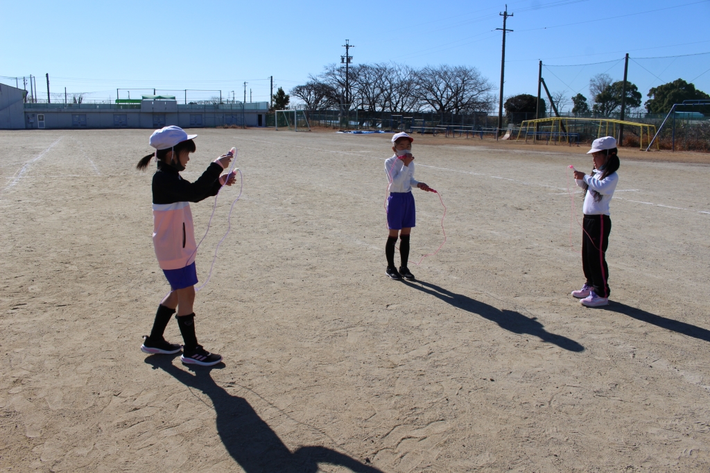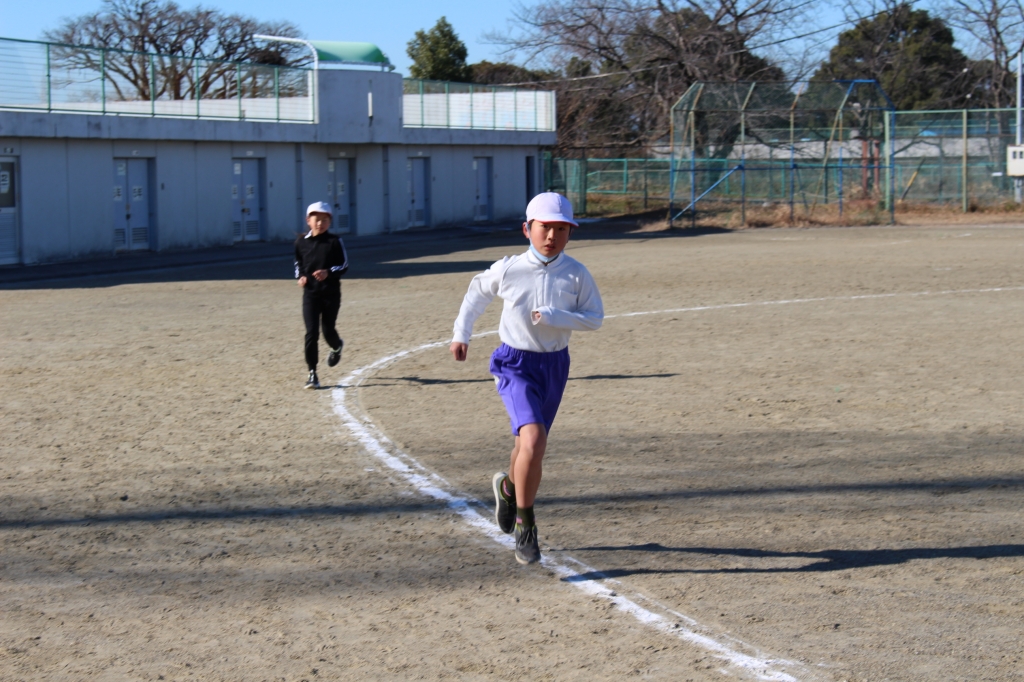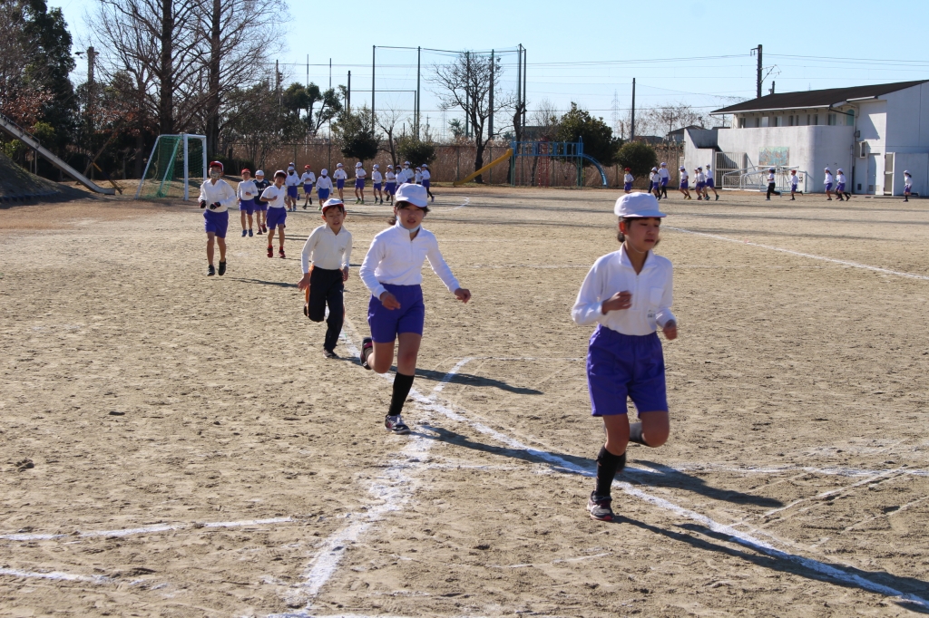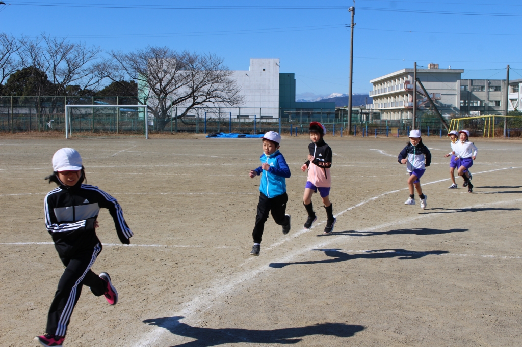 他にも、体育の授業では、冬の体力つくりとして、かけ足運動やなわとびに取り組んでいます。音楽に合わせて5分間走り続けることで、かぜに負けない体力をつけていきます。みんな、自分のペースで最後まで粘り強く走ることができ、頑張っています!!