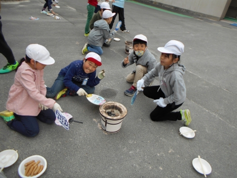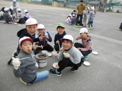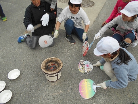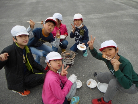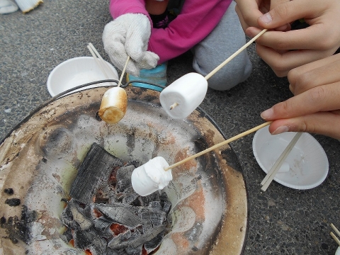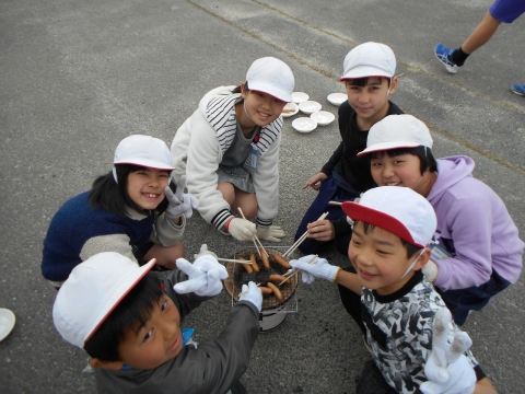 3年生の社会では、「昔の道具と人びとのくらし」という学習があります。その学習のまとめとして、七輪を使う体験を行いました。今の家庭では電気やガスで当たり前のように火を使っています。しかし、七輪では炭を燃やし、火をおこします。どのグループも炭に火をつけるのにとても苦労しました。炭に火がついたときは、みんな大喜びでした。先生の力を借りながら、どのグループもなんとか火をつけることに成功しました。その火を使い、ウインナーやマシュマロなどを焼いておいしく食べました。昔の人びとのくらしを少し体感し、今のくらしのよさをとても感じた時間だったと思います。