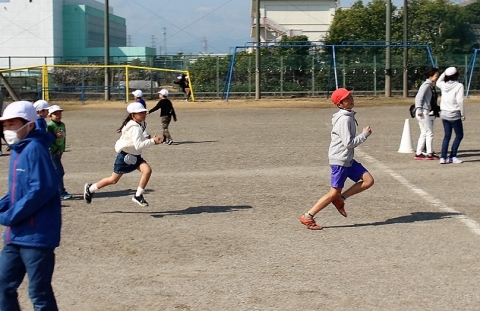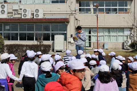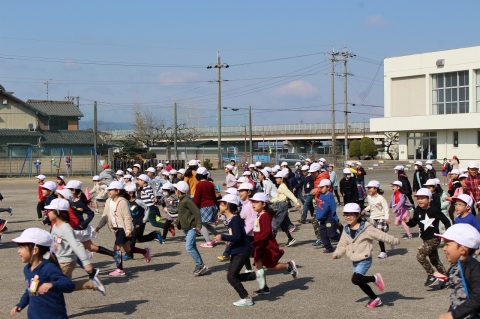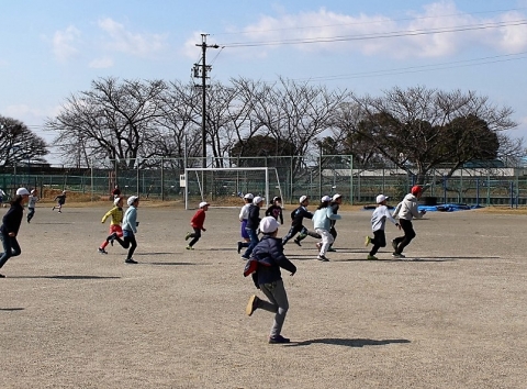 そんな中、今日の業間に児童会が企画した「この指とまれ」が行われました。2時間目が終わると、運動場の指令台前にたくさんの児童が集まりました。今日の遊びは、「6年生を探せ!!」でした。赤帽子をかぶって逃げる6年生を他の学年の児童が追いかけて捕まえる鬼ごっこです。6年生が逃げてから10秒後にゲームがスタート!! 全力に逃げる6年生をたくさんの児童が追いかけます。あっという間に何人かの6年生が捕まります。3分ほど経つと逃げいていた6年生がほぼ全員捕まってしまいました。追いかけられていた6年生も、捕まえようと必死に追いかけていた他学年の児童も楽しそうで、運動場中に笑顔がいっぱいでした。参加した6年生にとっては、疲れたけれど、卒業前のよい思い出になったのではないでしょうか?!