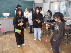 伝承遊びクラブで、けん玉とコマ回しをしました。けん玉では、とめけん(玉を垂直に引き上げ、けん先で受ける)やふりけん(