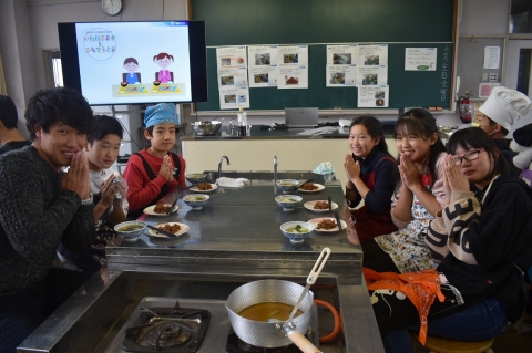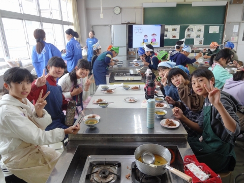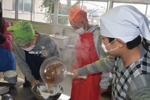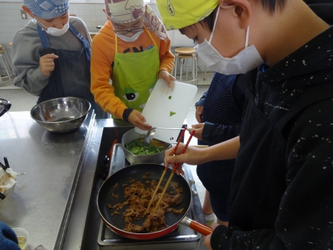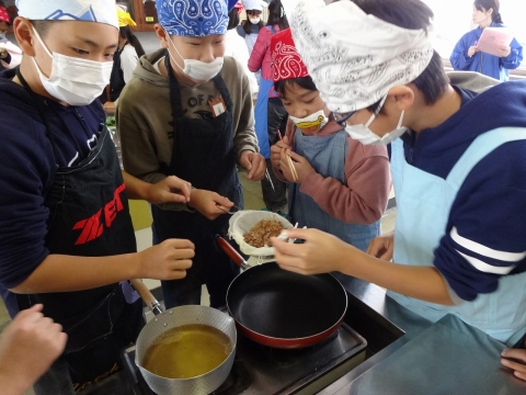 だしをとった後のだし殻も無駄にせず、フライパンで炒めて「おかか」を作りました。6年生みんな、グループの仲間と協力して、雑煮とおかかを作り上げました。そして、和食のすばらしさ、おいしさを感じながら、みんなで楽しく食べました。6年生にとって和食のよさを再確認し、日本の文化のすばらしさを感じ取ったひと時になったと思います。