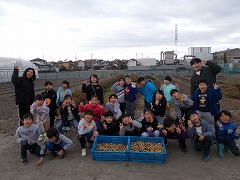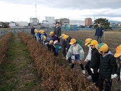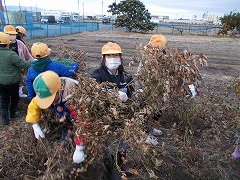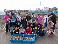 野菜名人から、落花生はピーナツのことで、地面の中で実がなることを教えていただきました。初めて聞いた子も多く、驚きの声をあげている子もいました。次は収穫です。一株を丸ごと引き抜くと、株についている実を1つずつちぎってまとめていきました。株は、2年生の子どもたちでも抜くことができました。しかし、一株には無数の実がなっています。時間がかかりましたが、子どもたちは粘り強くちぎっていきました。また、地面の中からカエルが出てきて、子どもたちはびっくり!「なんで土の中にいるの?」「死んでるの?」と子どもたち。生き物の冬眠を知るいい機会にもなりました。最後に、落花生をまとめると、各クラスでビニール袋2つ分の収穫になりました。一人ではとても持つことができない量になりました!