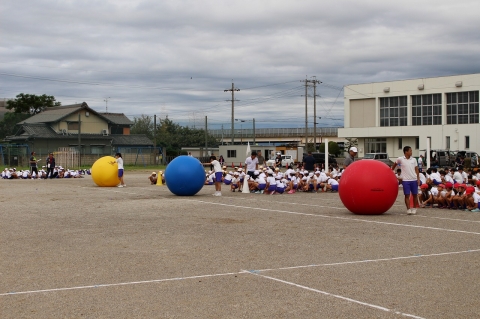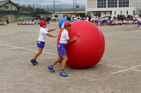 『BBKK』は、「ビッグボールコロコロ」の略です。運動会で全員で行う生徒会・児童会種目です。今日の合同練習で初めて競技の練習をしました。小学生には大きなボールであるため、進んだり、方向転回するのに苦労していましたが、本番に備えていい練習になりました。大玉が行き来し、迫力のある競技です。運動会当日を楽しみにしてほしいと思います。