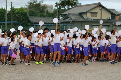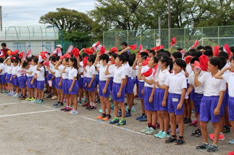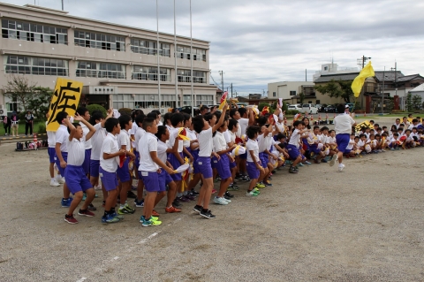 また、応援合戦の練習も行われ、中学生のリーダーを中心に完成をめざし、がんばっていました。各組とも声も大きくそろえ、動きもみんなが覚え、かなりの完成度になってきました。通し練習も行い、本番に向けて準備が整ってきました。