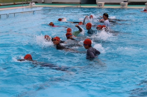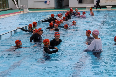 二宮先生が、「今日は『命』について学ぶ授業です」と話し始め、着衣泳がスタートしました。服を着たまま水の中を歩いたり、クロールで泳いだりし、水着との違いを体感しました。