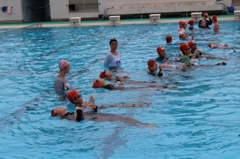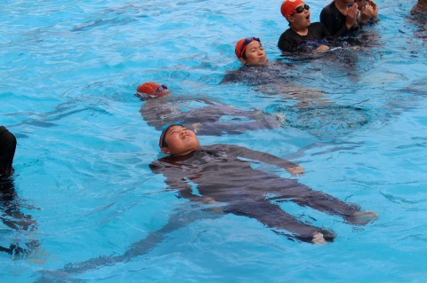 溺れそうになった場合、背浮きが有効であることを学ぶことができました。その後、溺れた人に遭遇した場合に救助用の浮輪など浮くものを近くに投げたり、AEDで救命救急をしたりということの大切さを教えてもらいました。