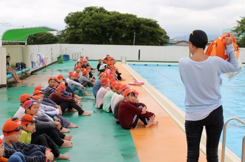 「動きにくい」「重い~」などの感想が児童から出ました。そのため、海や川で溺れそうになった時の行動を教えていただきました。