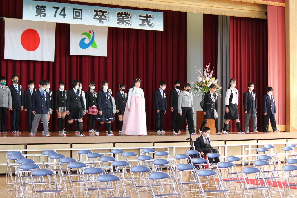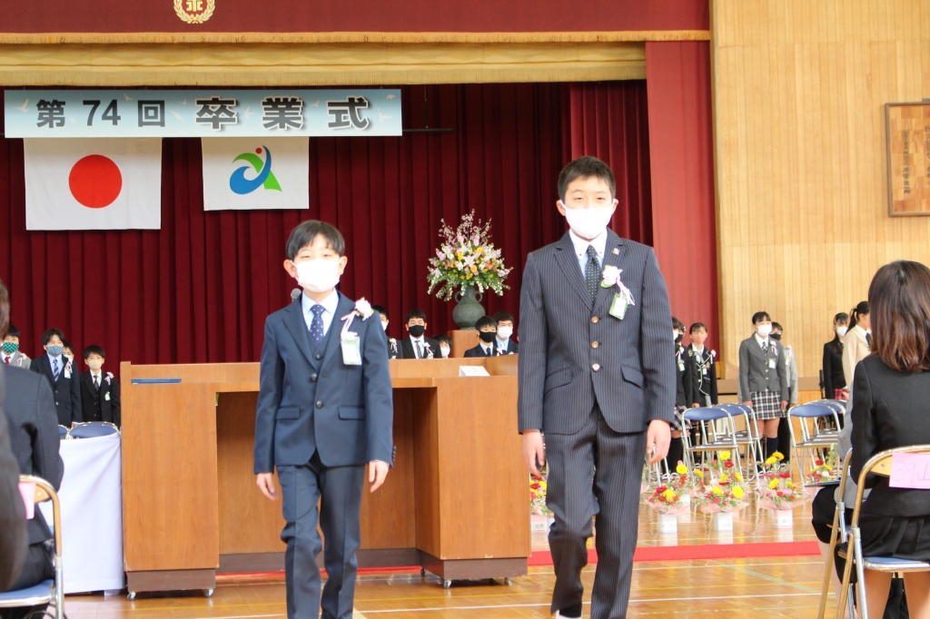 3月19日(金)、さわやかに晴れ、暖かな春の日になりました。第74回永和小学校卒業式が行われました。今年度も、卒業生と保護者の方、職員のみの参加で卒業式が行われました。