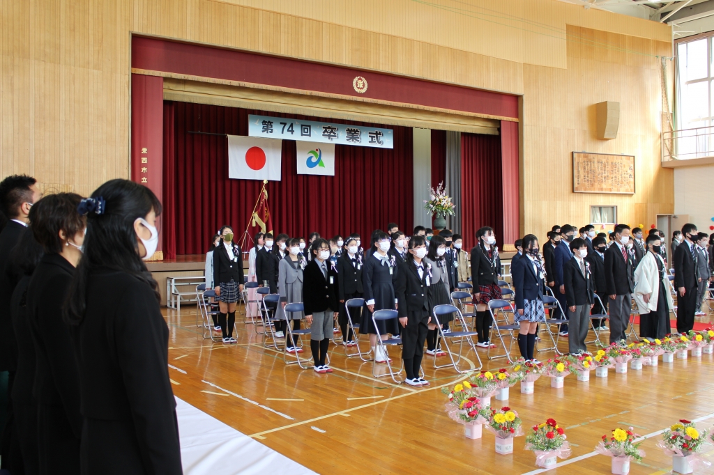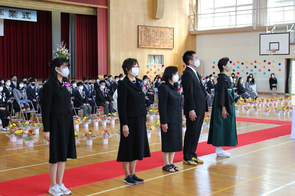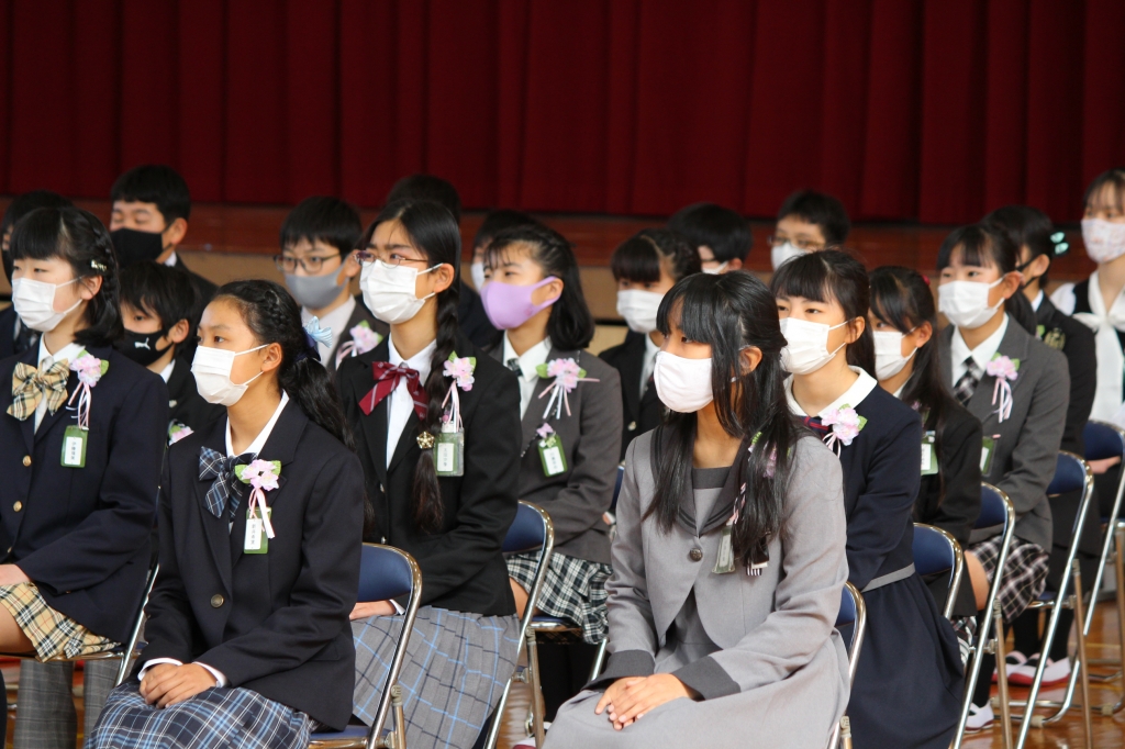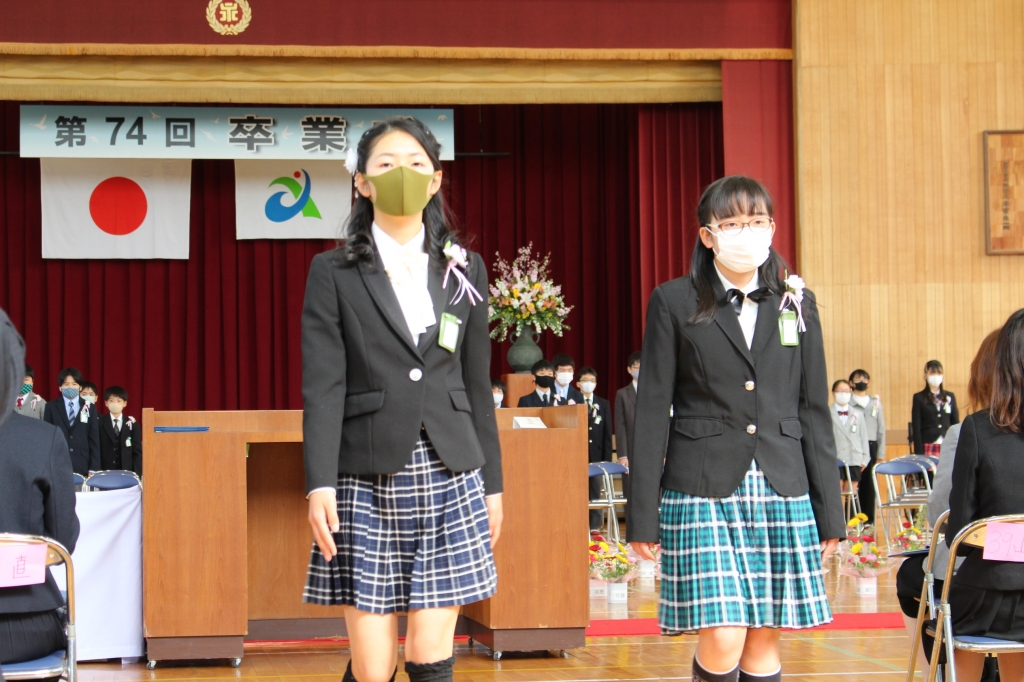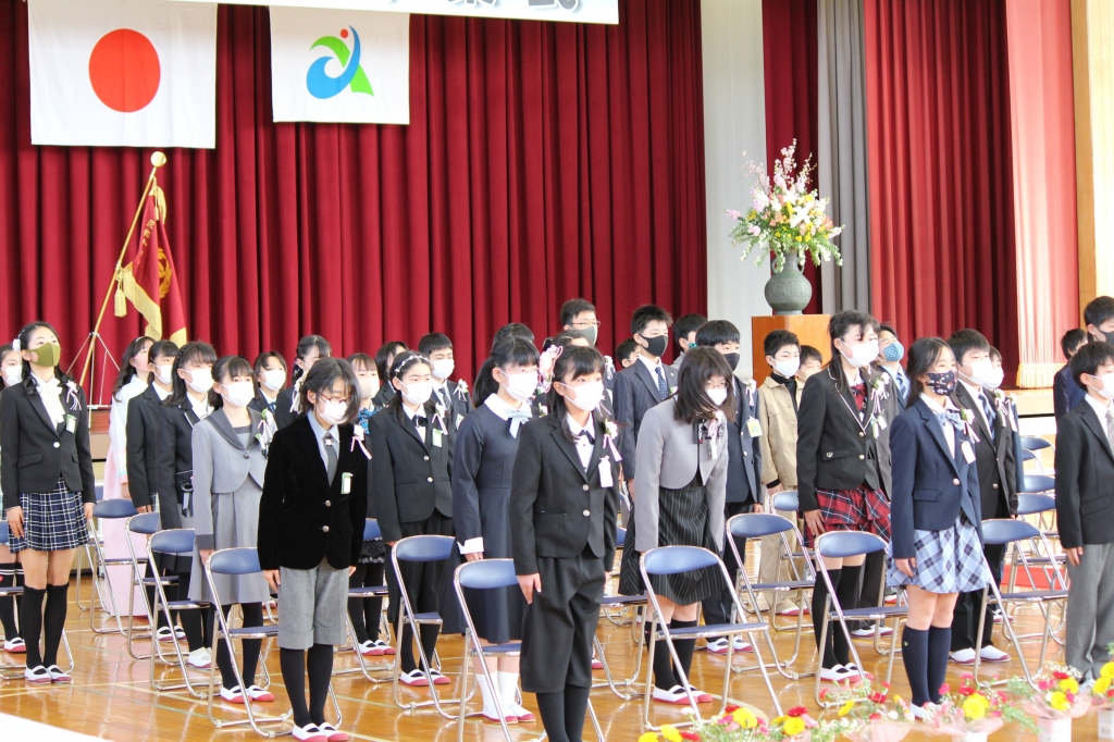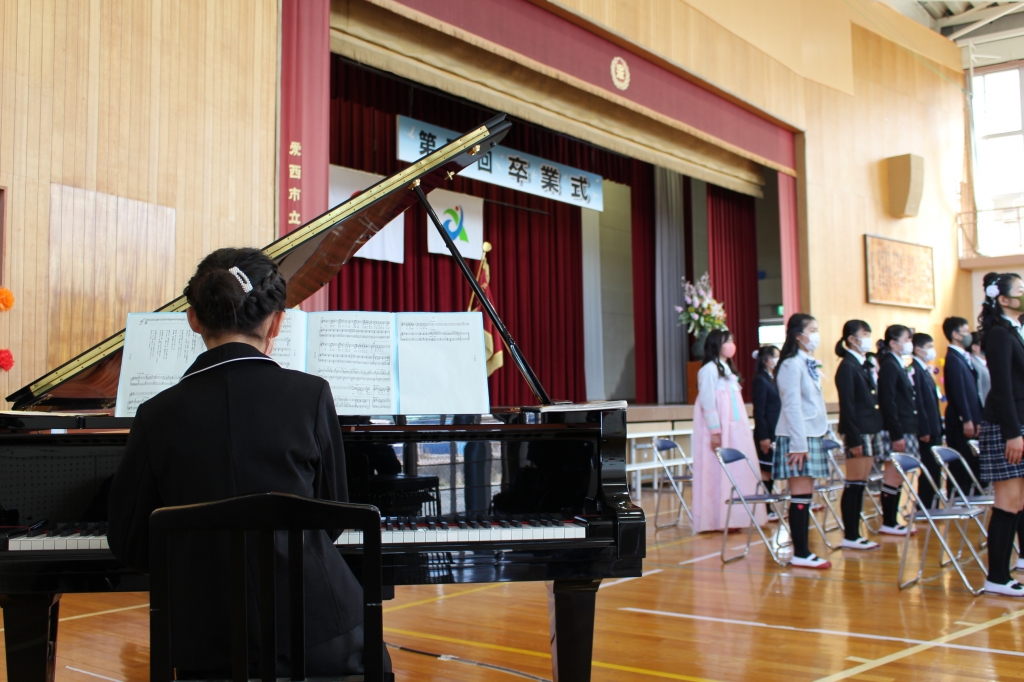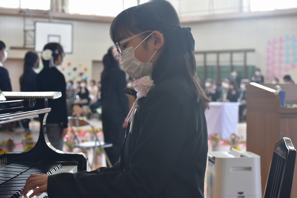 今年は、ソーシャルディスタンス、マスクの着用、運動場での練習と、感染症予防の対策をしながら、合唱の練習をしてきました。ただ残念ながら、卒業式では感染症予防の観点から、合唱や呼びかけは行えませんでした。そのため、校歌と卒業の歌については、伴奏のみとなりましたが、みんな心の中で歌詞を思い浮かべ、伴奏を聞きました。