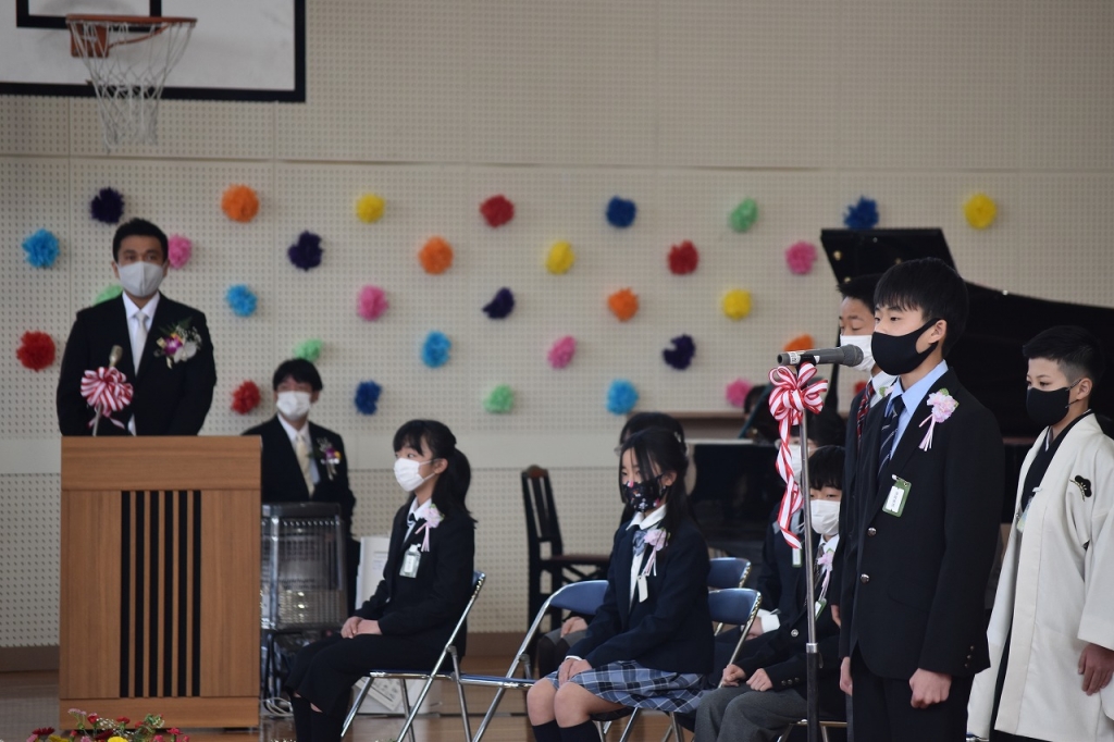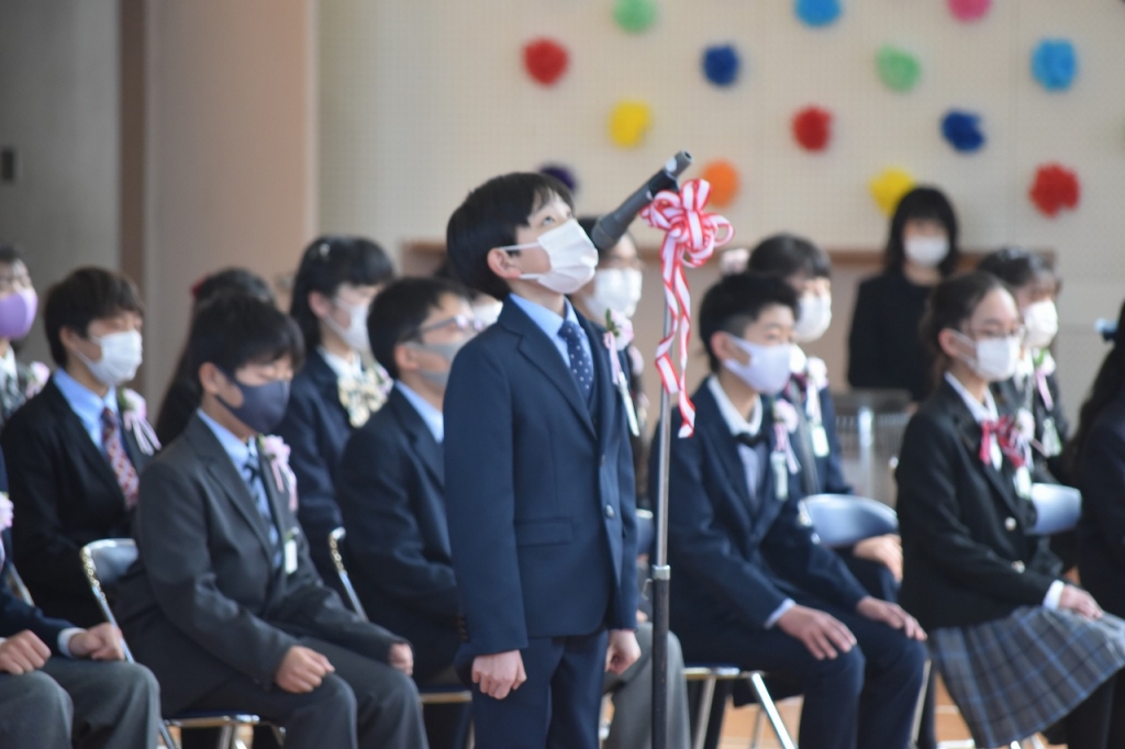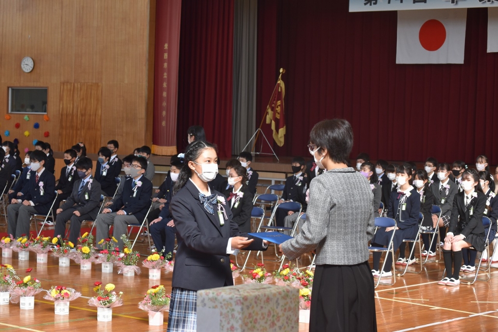 卒業生の入場は舞台側からでした。みんな凜々しい姿で入場し、たくましく成長した姿を見せてくれました。入場後は卒業証書授与です。今年は証書を受け取る前に、一人一言、メッセージや決意を発表しました。家族への感謝の気持ちを伝えたり、中学校へ向けての決意や将来の夢を発表したりと、それぞれが思い思いの発表をしました。また今年は、子どもたちの晴れの姿を、少しでも近くで保護者の方に見ていただければと考え、子どもが受け取った卒業証書を、直接保護者の方に手渡しで受け取ってもらいました。