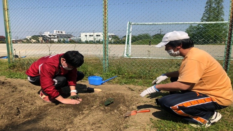 本当であれば、2年生の生活科で夏野菜を植えるところから自分たちで夏野菜を育てる予定でしたが、季節の関係で予定通りには行えません。したがって、先生たちが責任をもって畑に夏野菜の苗を植えました。学校が再開されたら、2年生みんなで大切に育てましょうね!!!