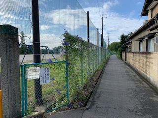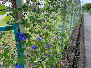 夏休み後半から西門付近のフェンスにアサガオの壁ができています。今朝もアサガオの花がきれいに咲き、みんなの登校を見守っていました。