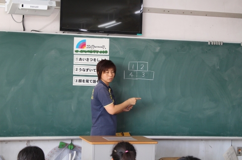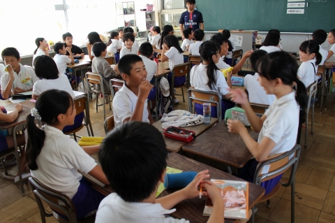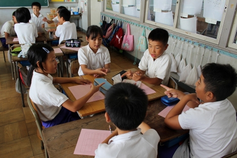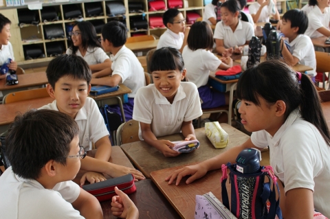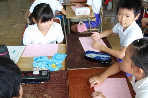全校での取り組みで、どのクラスも『エイトーク、』の目的や方法を先生から聞き、実践していました。グループで話す内容も「きょうのあさごはんは?」など、誰でもすぐに話せるお題でみんな楽しそうに自分のことを話していました。その話をうなずいて聞いている児童もいました。この活動を全校で続けていき、話す力・聞く力を育てていきたいと思います。