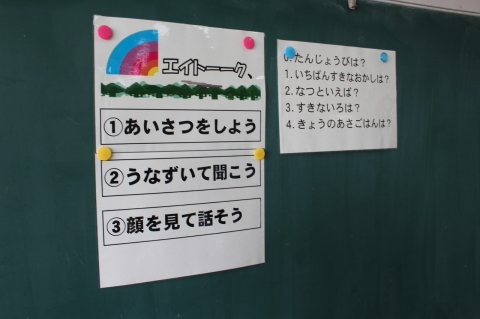 永和小学校では、話す力・聞く力をつけるために今日から『エイトーク、』という時間がスタートしました。『エイトーク、』では、仲間との楽しい対話を通して、話す力・聞く力を育てていきます。毎週金曜日の朝の会の前に行っていきます。