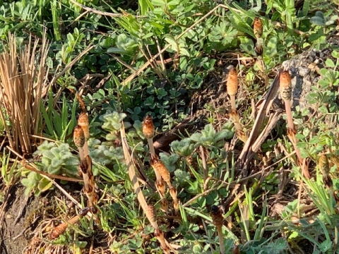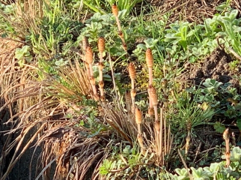 ところで、運動場のふちに目をやると、つくしが顔を出し始めました。