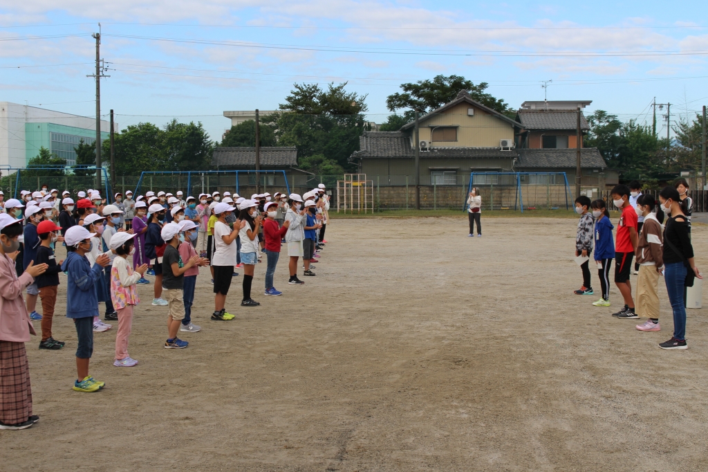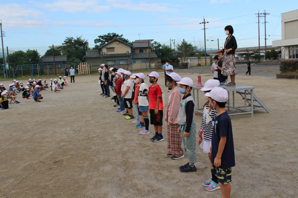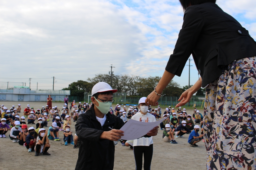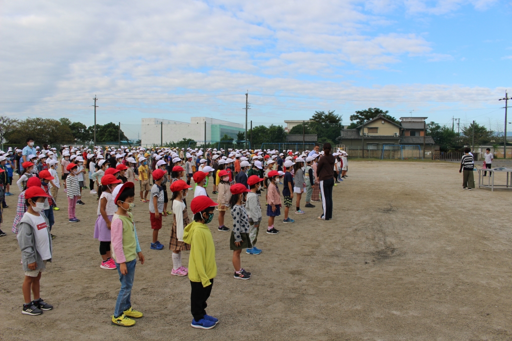 週が明け、10月12日(月)からは後期の開始です。朝、運動場で全校児童が揃って朝礼を行いました。今年度初めての全校朝礼ということで、移動の仕方や並び方など、一つひとつ確認しながら行いました。