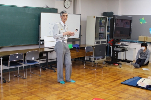 本年度もプール開きを6月14日(金)に予定しています。プール指導が始まる前に毎年、先生の救命救急講習を行っています。本年度も愛西市消防本部の加藤さんを講師にお迎えし、胸骨圧迫の方法やAEDの使い方を教えていただきました。参加した先生たち全員が練習用の人形を使って実習しました。プール指導や日常の学校生活のいろいろな場面を想定して、救急に関わる内容を詳しく教えていただきました。いざという時の行動や技能を学び、プール指導のひとつの準備ができました。